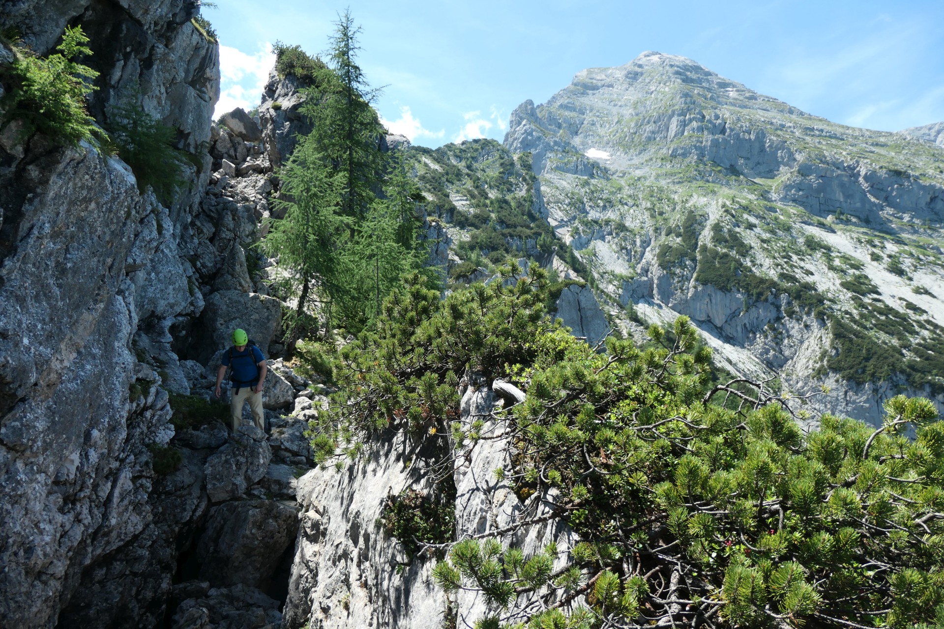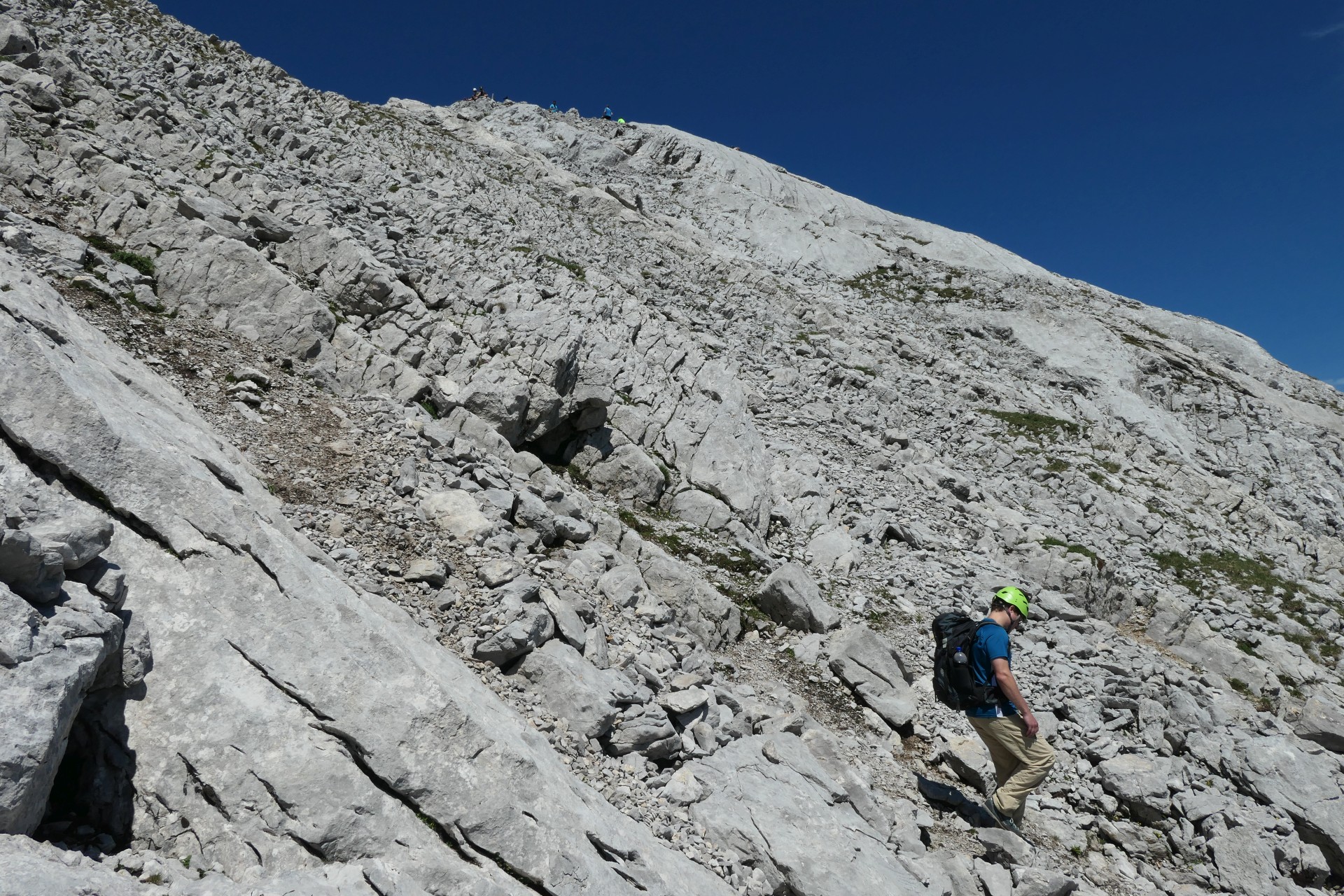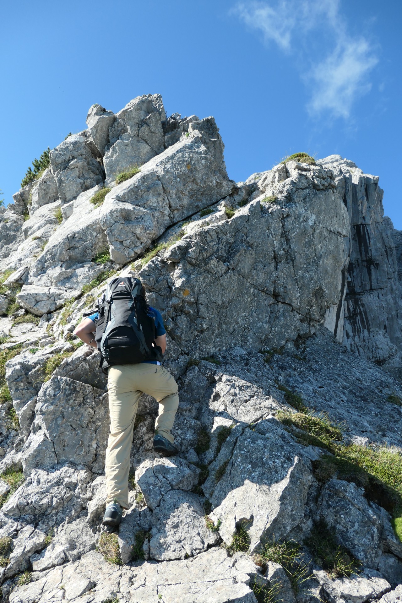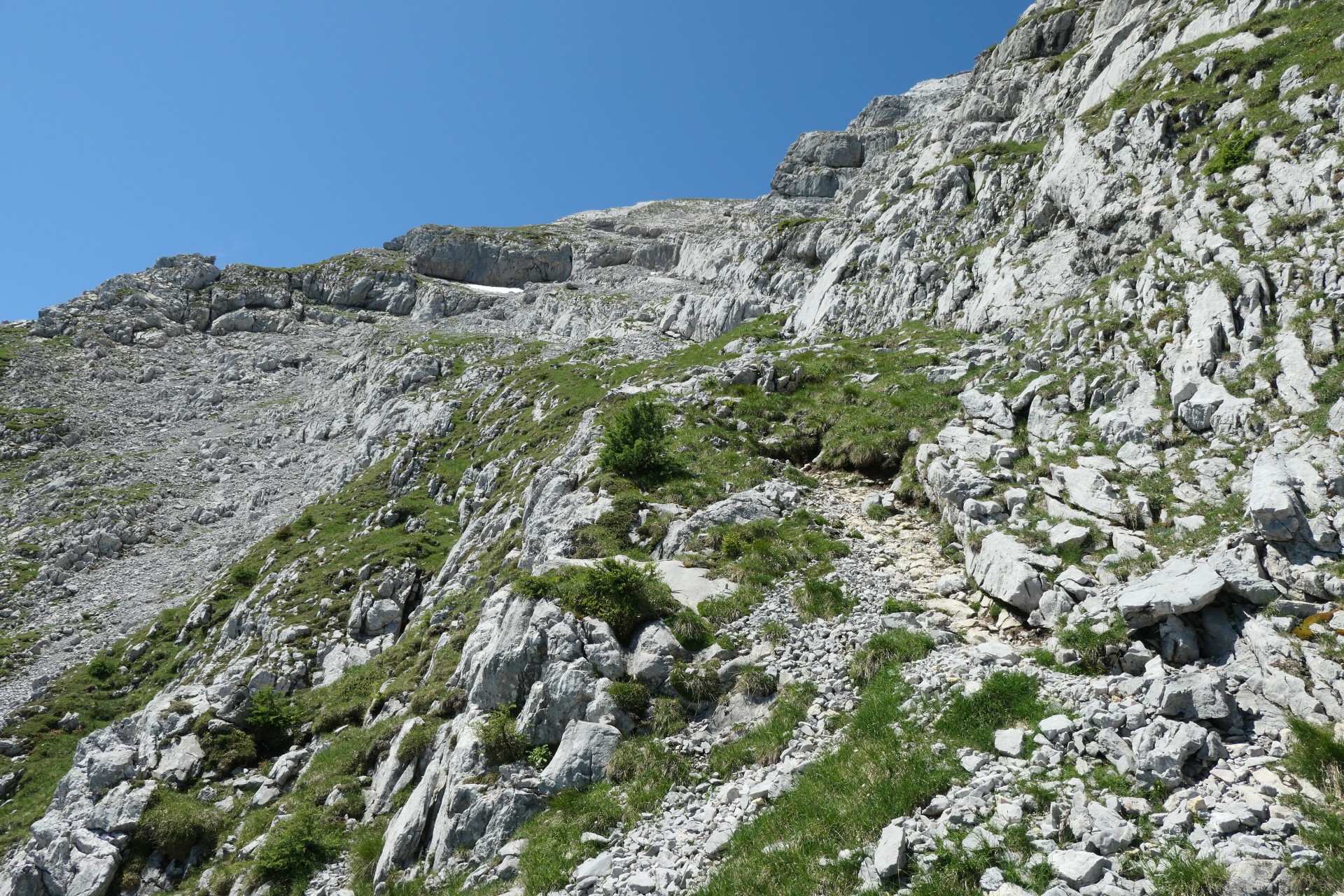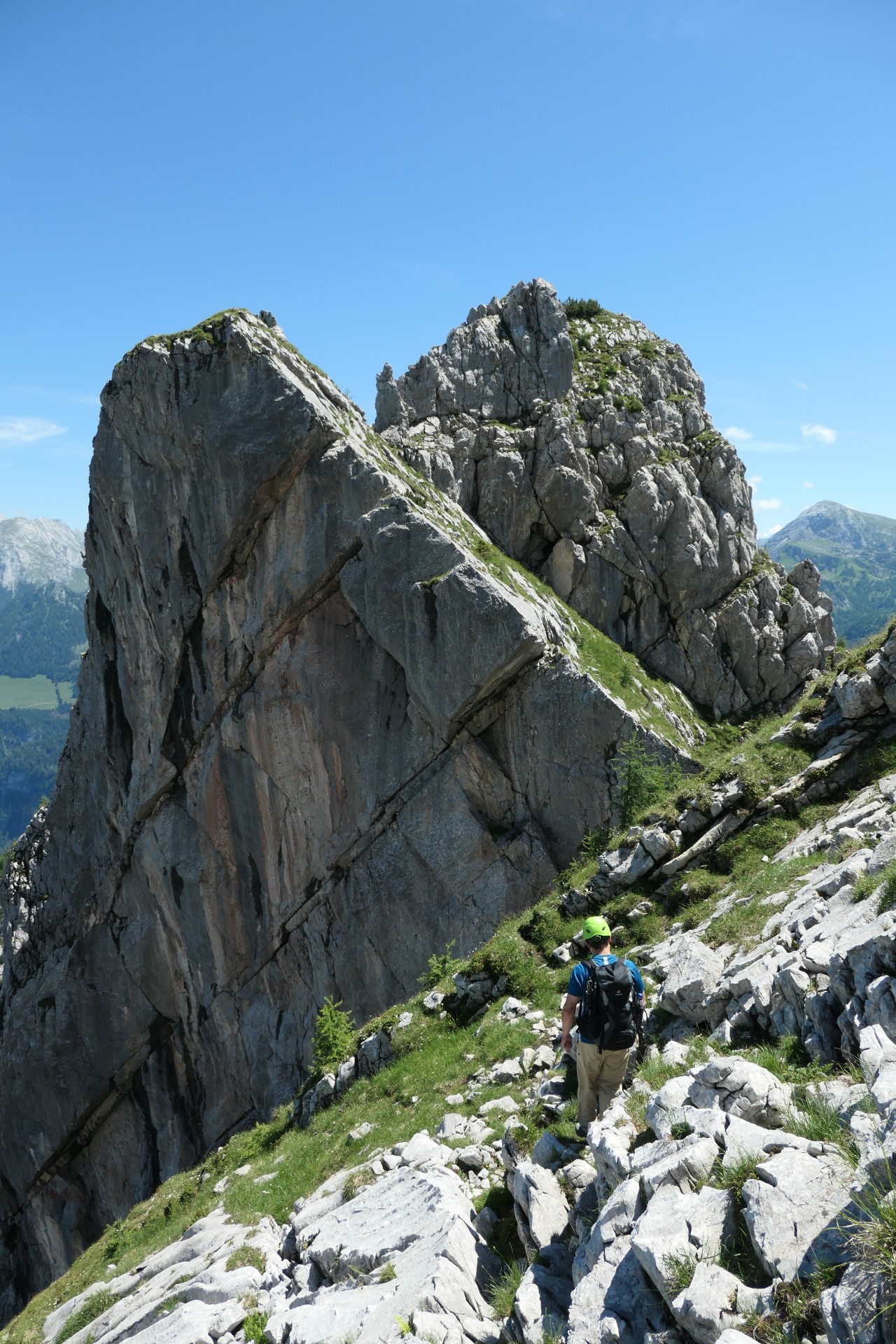 Im Wald anfangs flach dann immer steiler werdend bis zum Gendarm. Hier kurze ausgesetzte 2er Kletterei mit Bohrhaken. Danach am Nordgrat entlang und später in der Flanke steil empor. Immer wieder einfach Kletterei. Trotz zahlreicher Markierungen Wegfindung nicht ganz einfach. Zuletzt über Platten zum Gipfelkreuz.