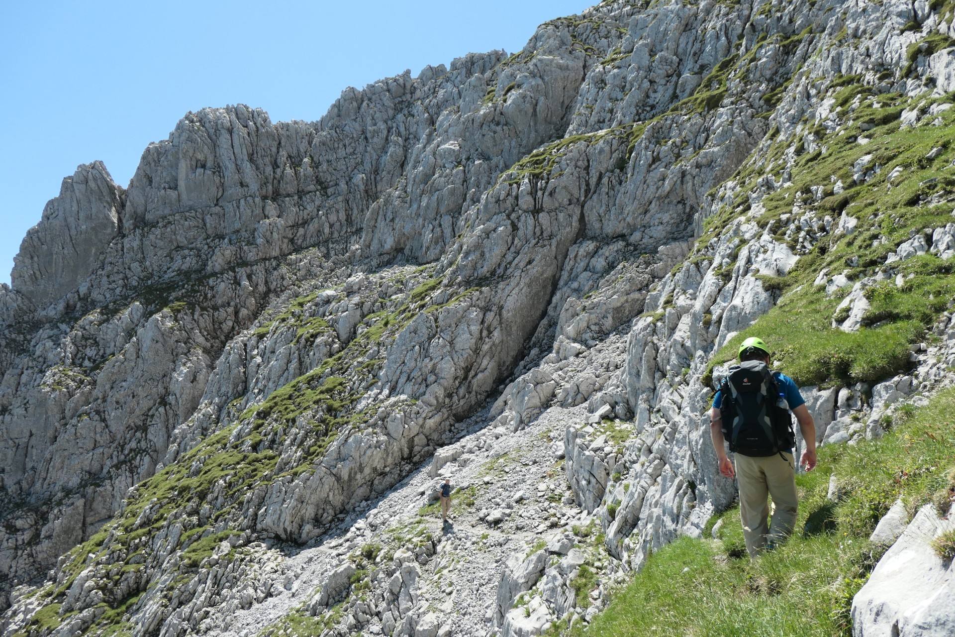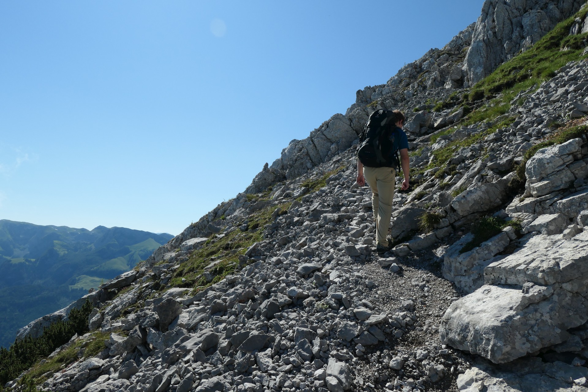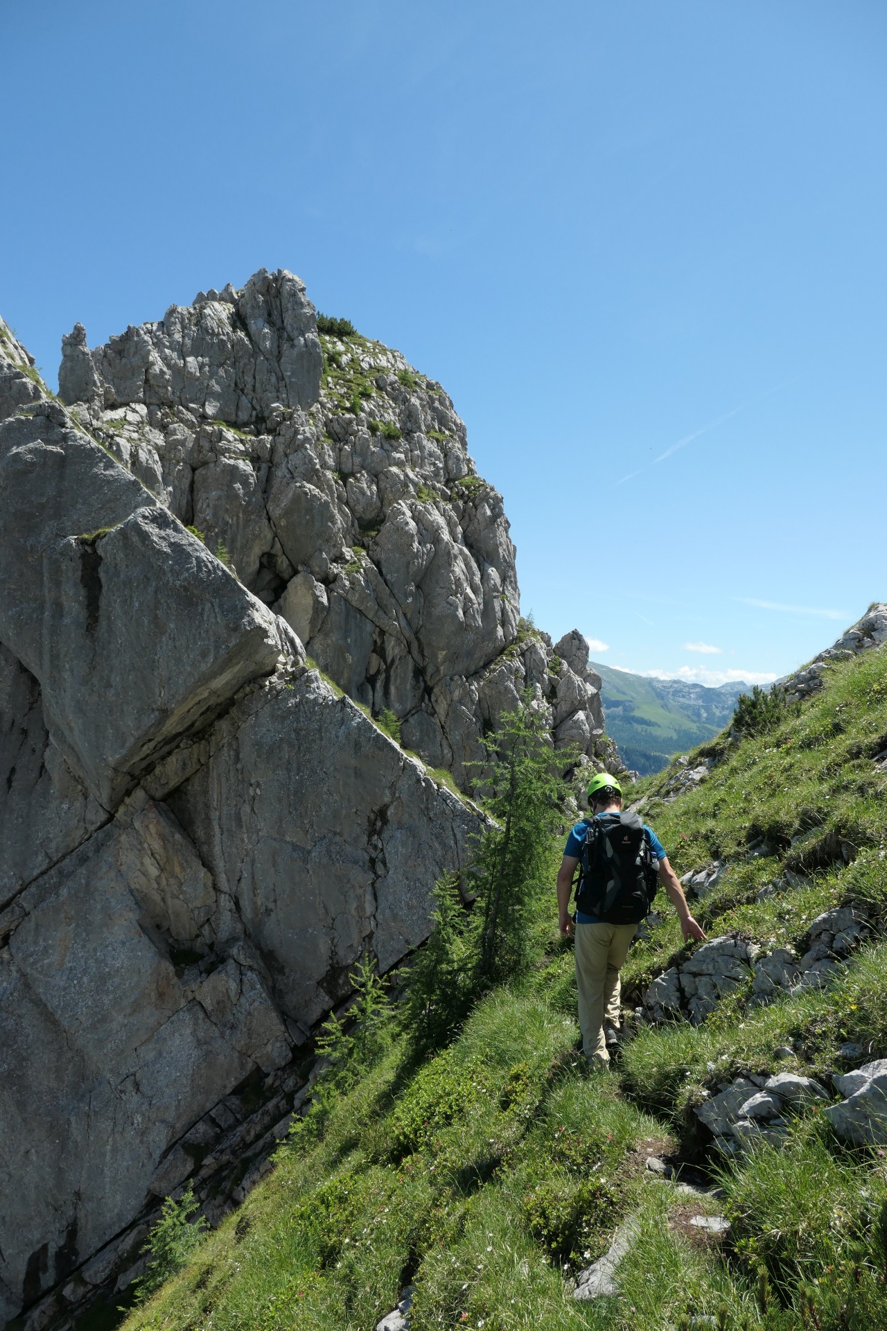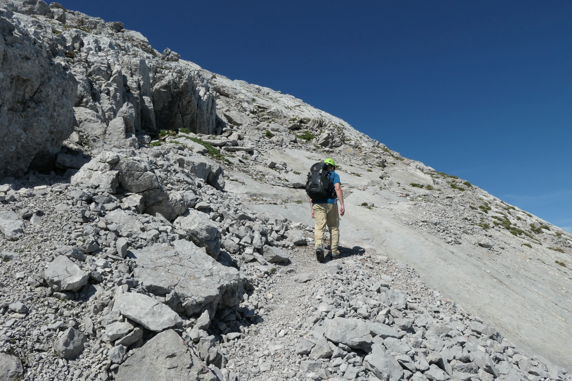 Im Wald anfangs flach dann immer steiler werdend bis zum Gendarm. Hier kurze ausgesetzte 2er Kletterei mit Bohrhaken. Danach am Nordgrat entlang und später in der Flanke steil empor. Immer wieder einfach Kletterei. Trotz zahlreicher Markierungen Wegfindung nicht ganz einfach. Zuletzt über Platten zum Gipfelkreuz.