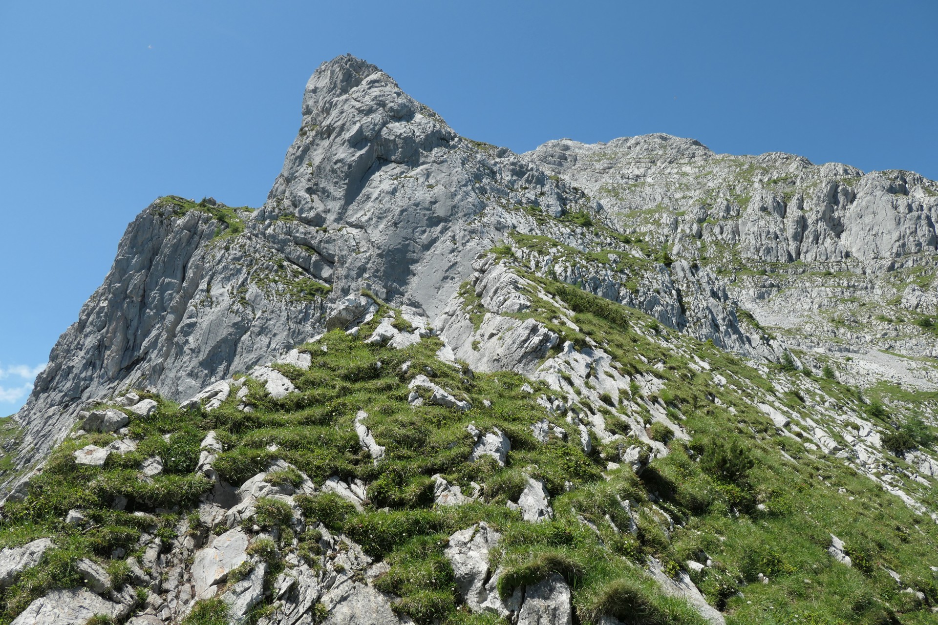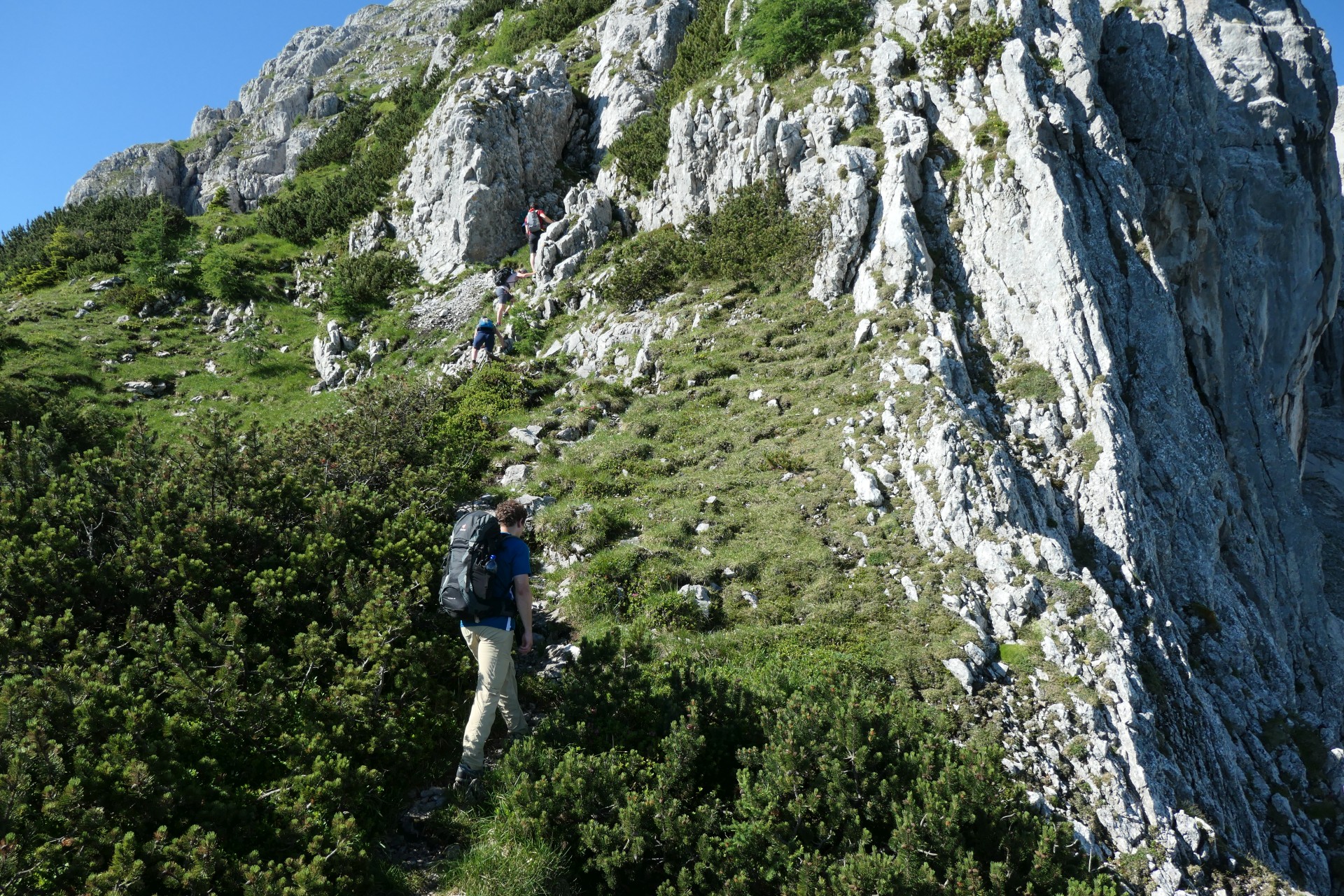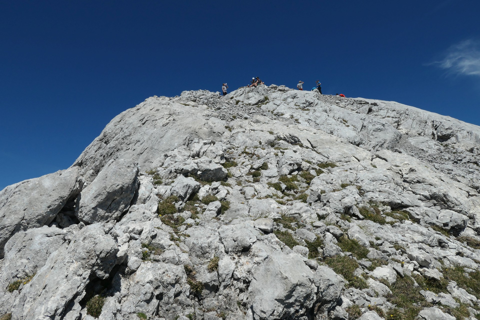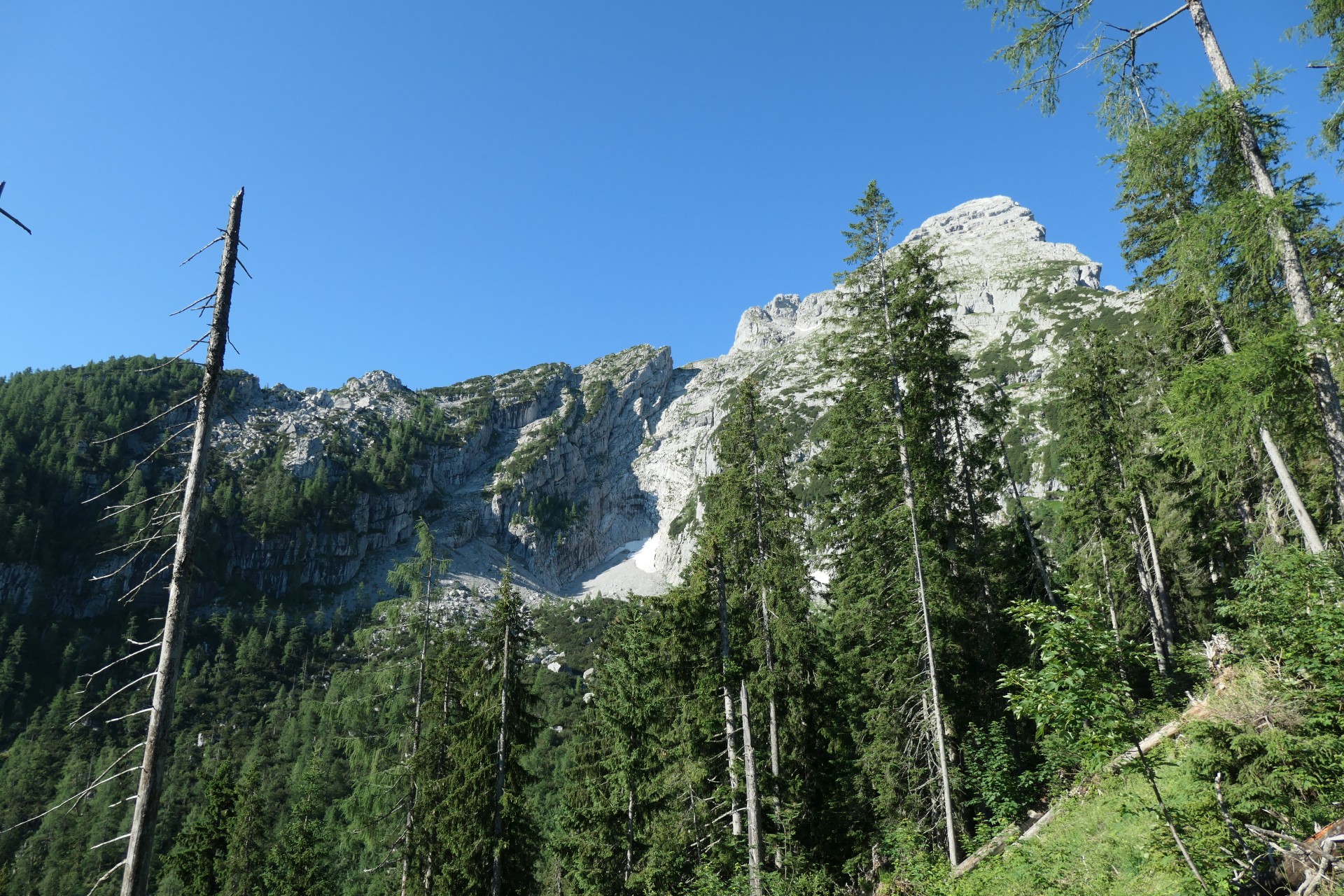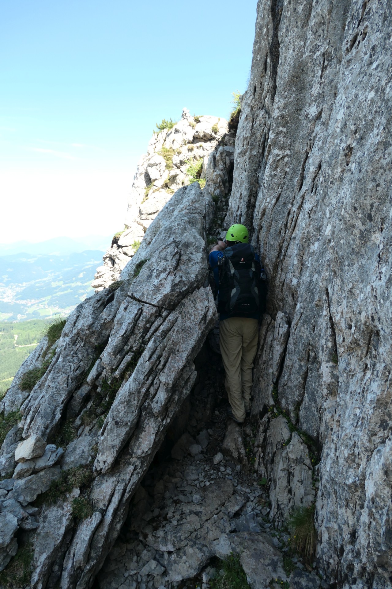 Im Wald anfangs flach dann immer steiler werdend bis zum Gendarm. Hier kurze ausgesetzte 2er Kletterei mit Bohrhaken. Danach am Nordgrat entlang und später in der Flanke steil empor. Immer wieder einfach Kletterei. Trotz zahlreicher Markierungen Wegfindung nicht ganz einfach. Zuletzt über Platten zum Gipfelkreuz.
