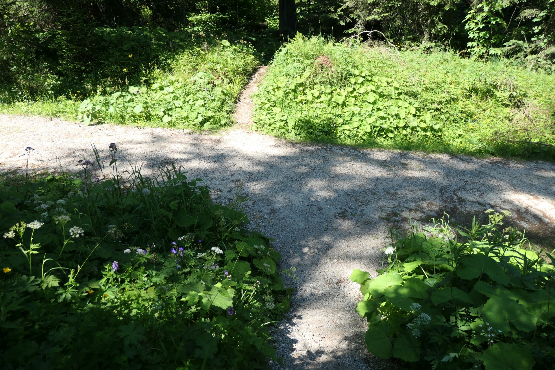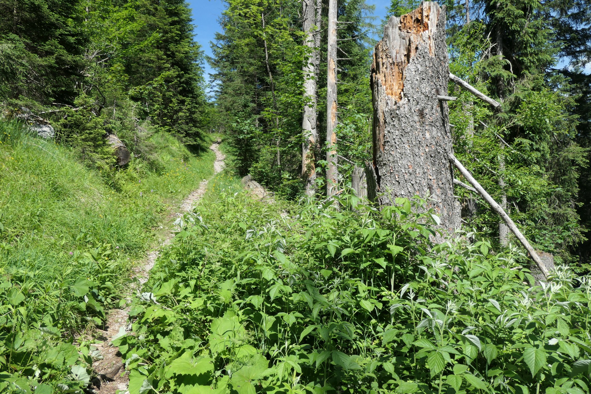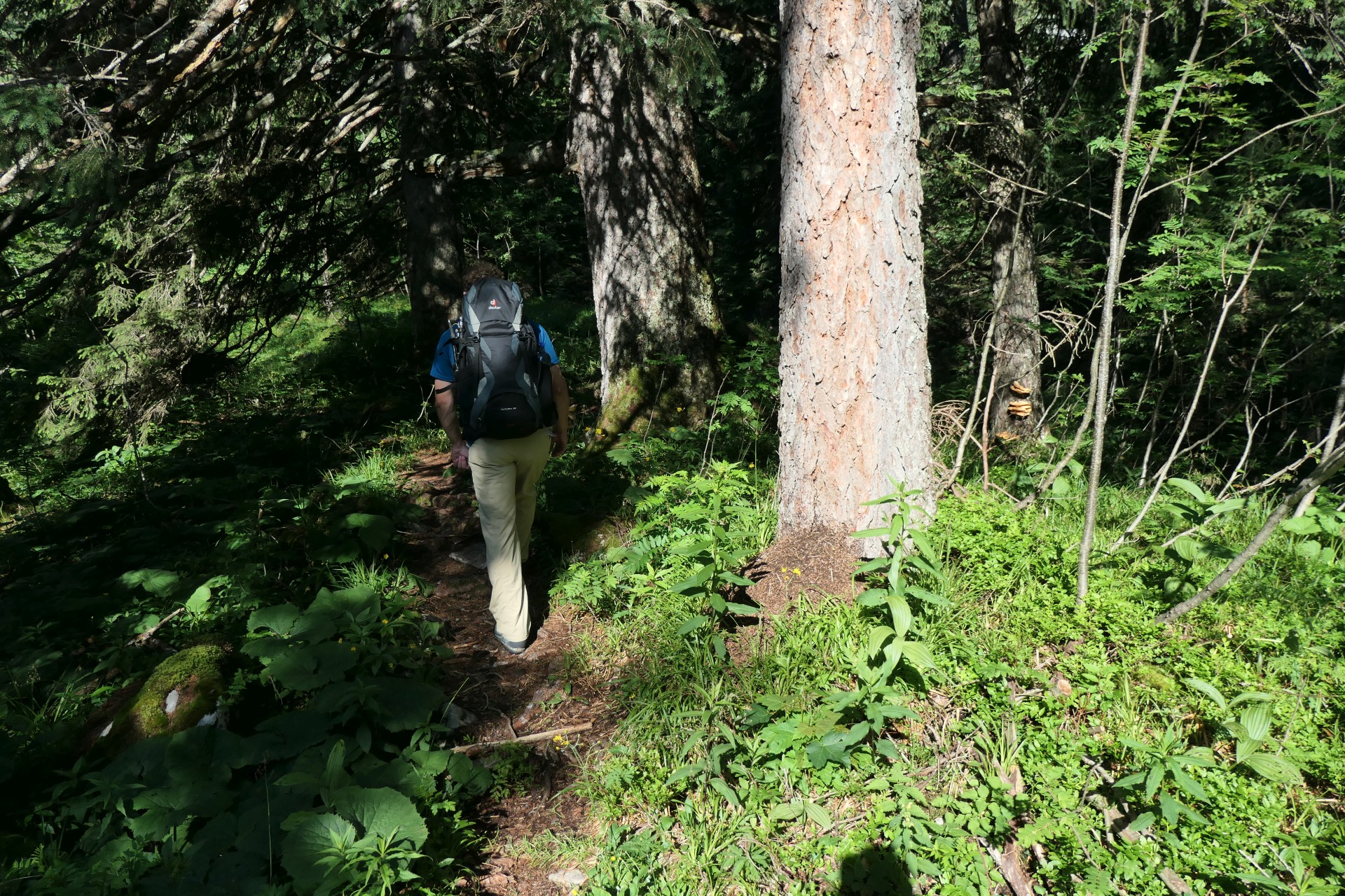 Von Kühroint die alte Piste rauf in den Wald auf schmalem Steig.