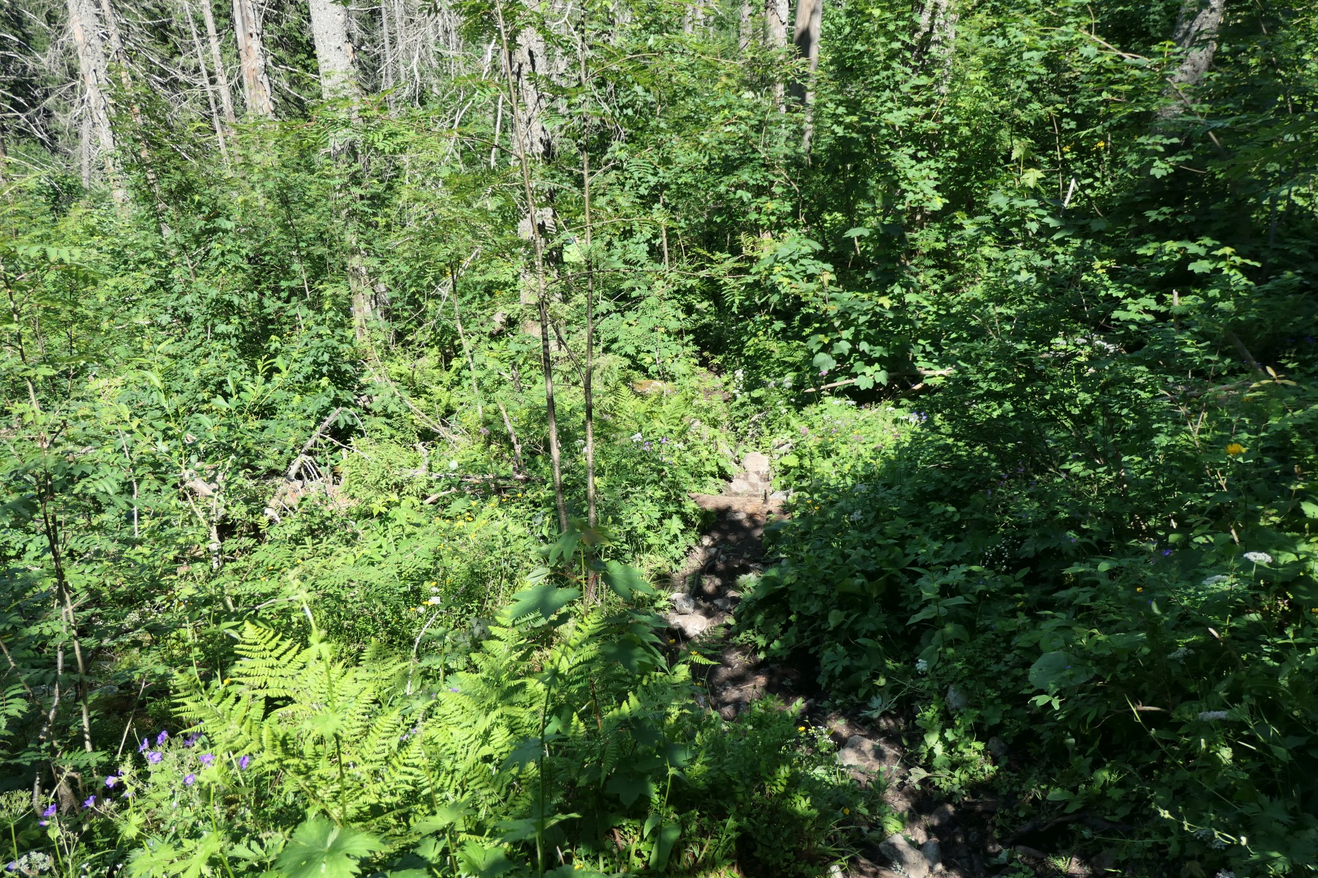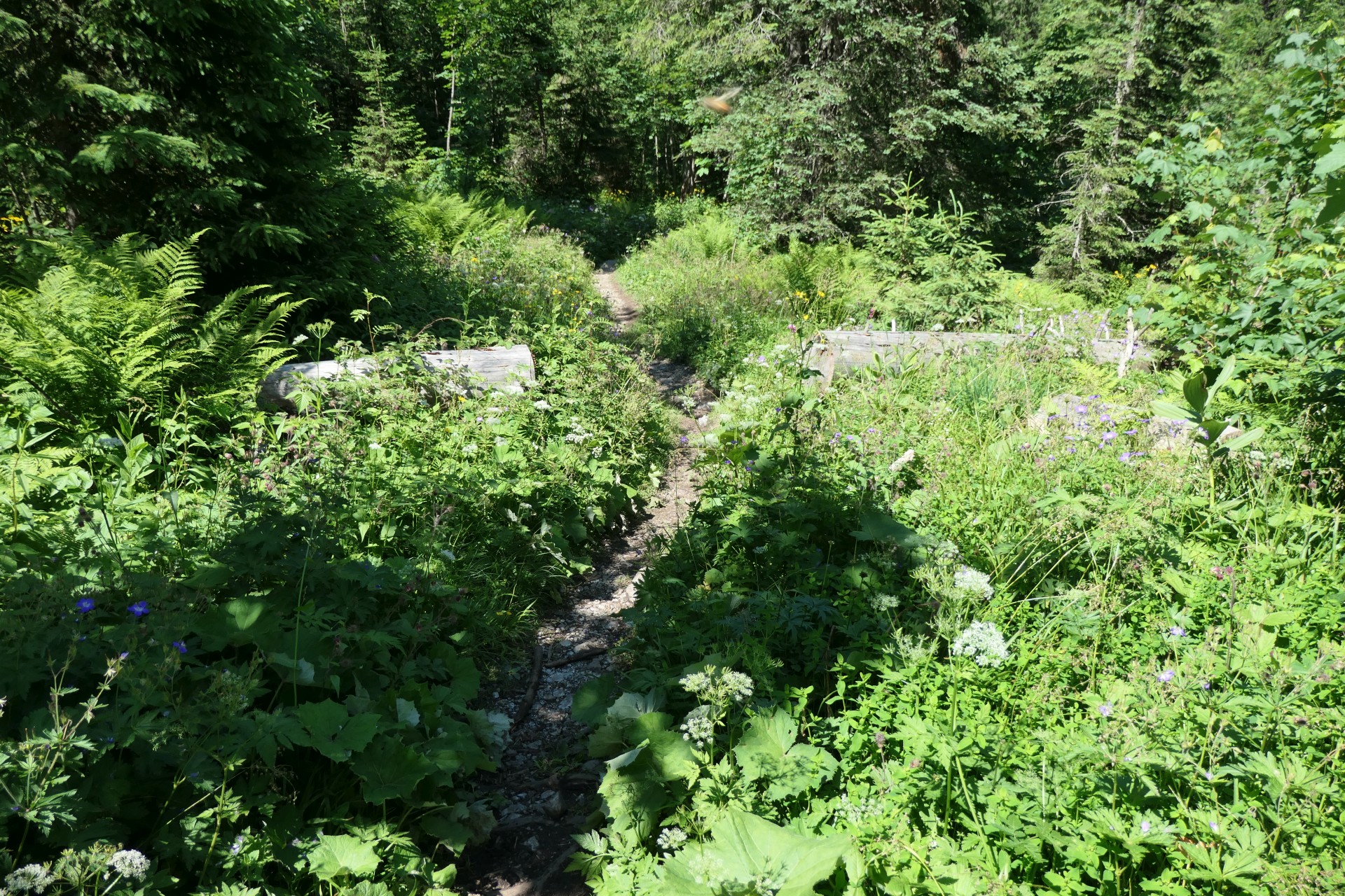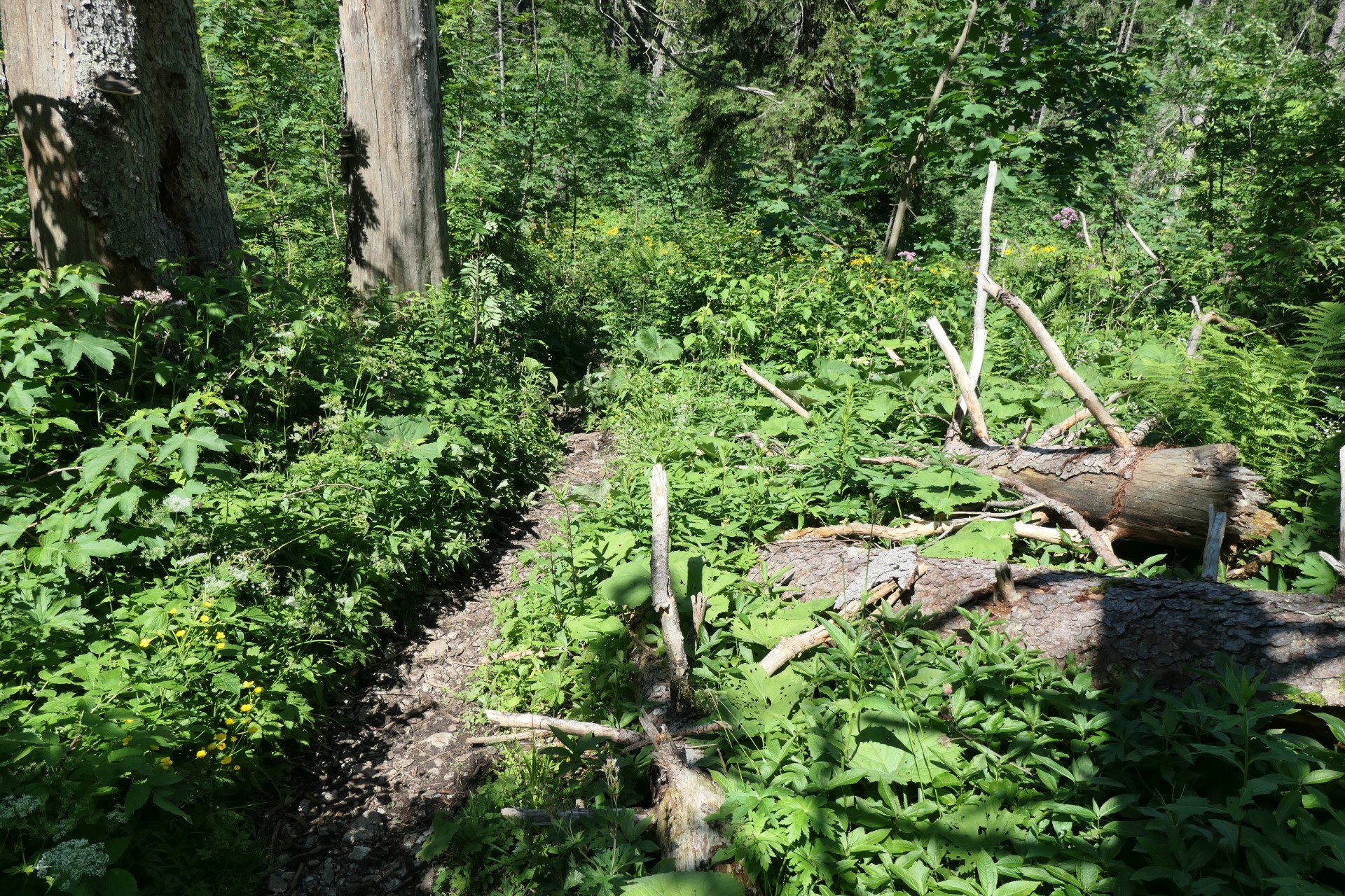 Von Kühroint die alte Piste rauf in den Wald auf schmalem Steig.