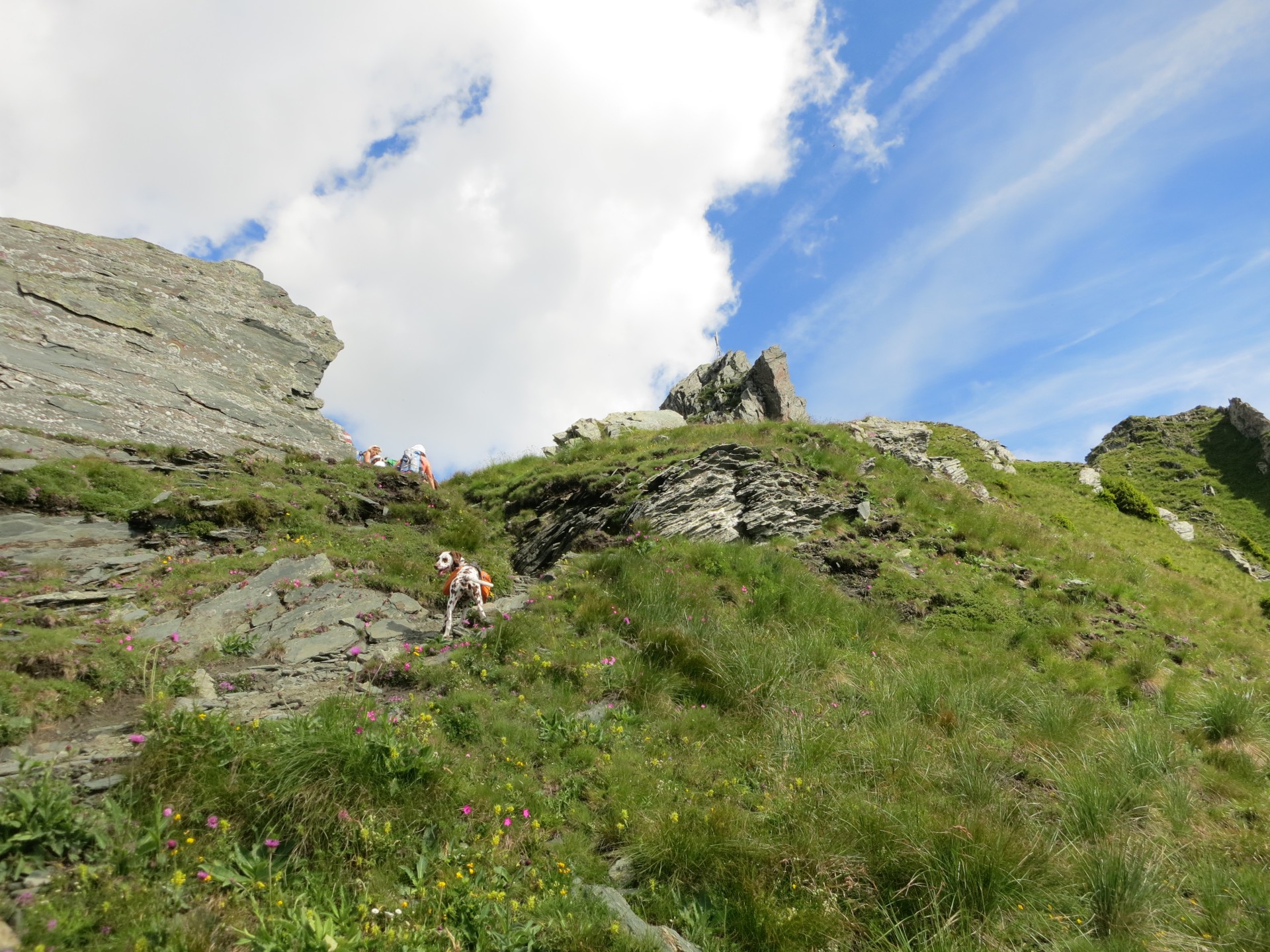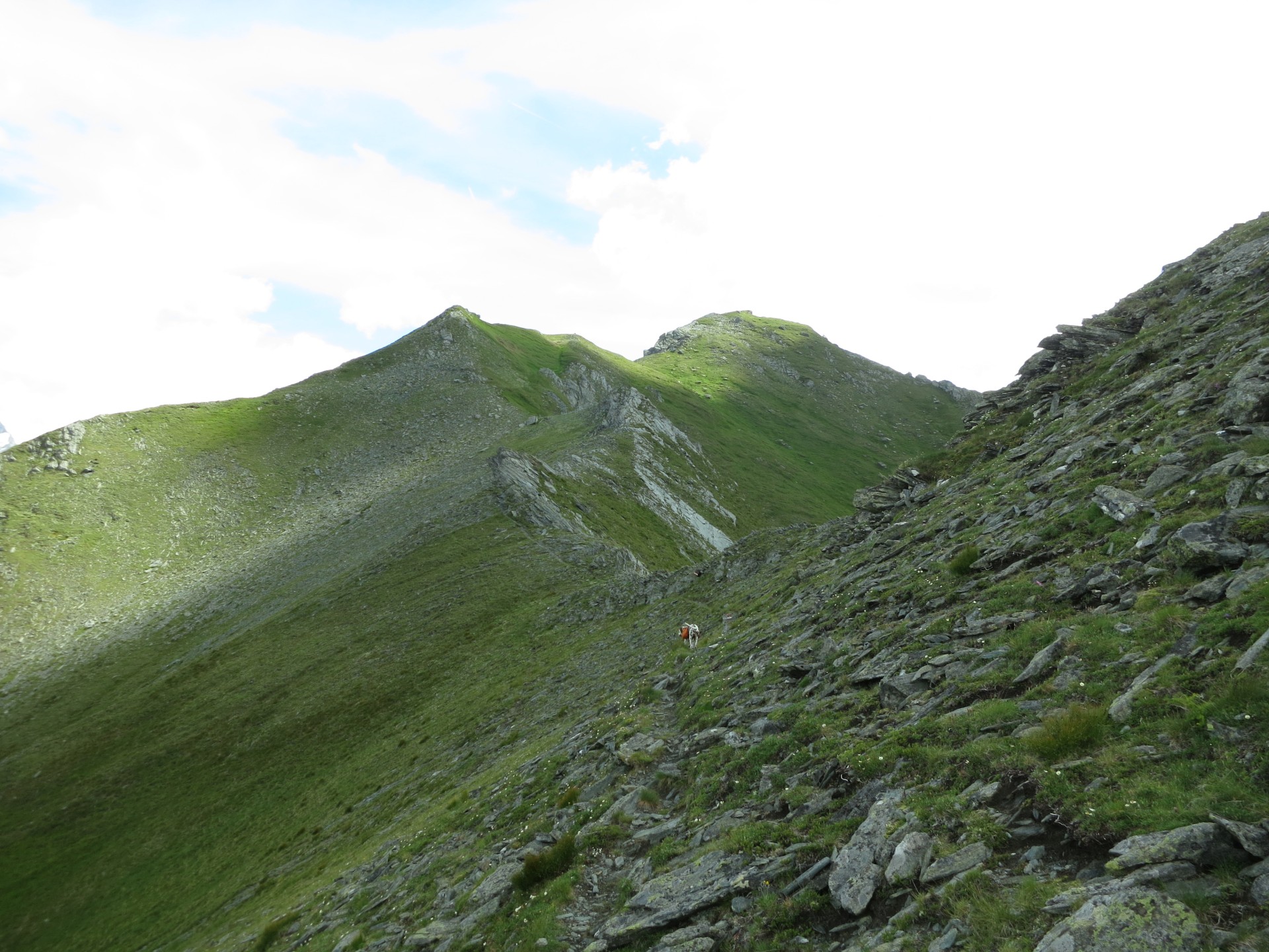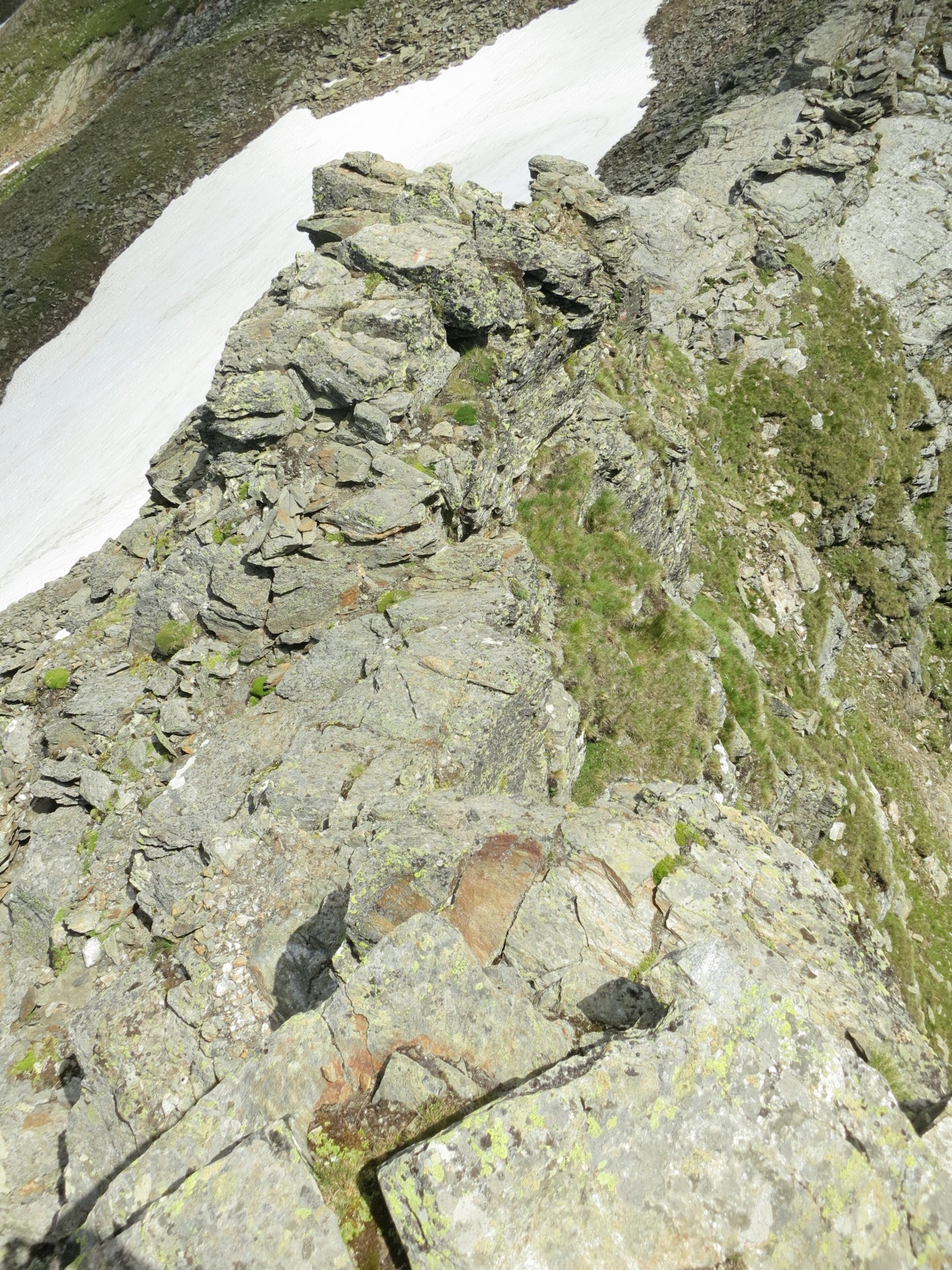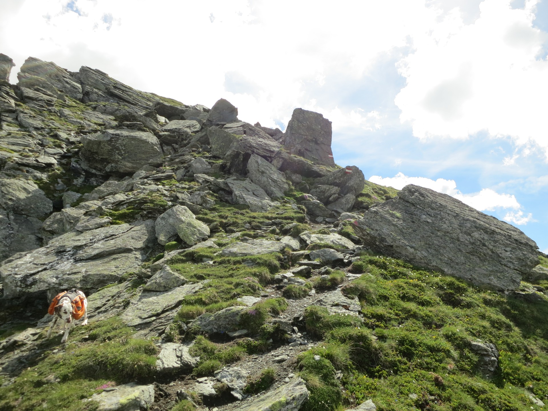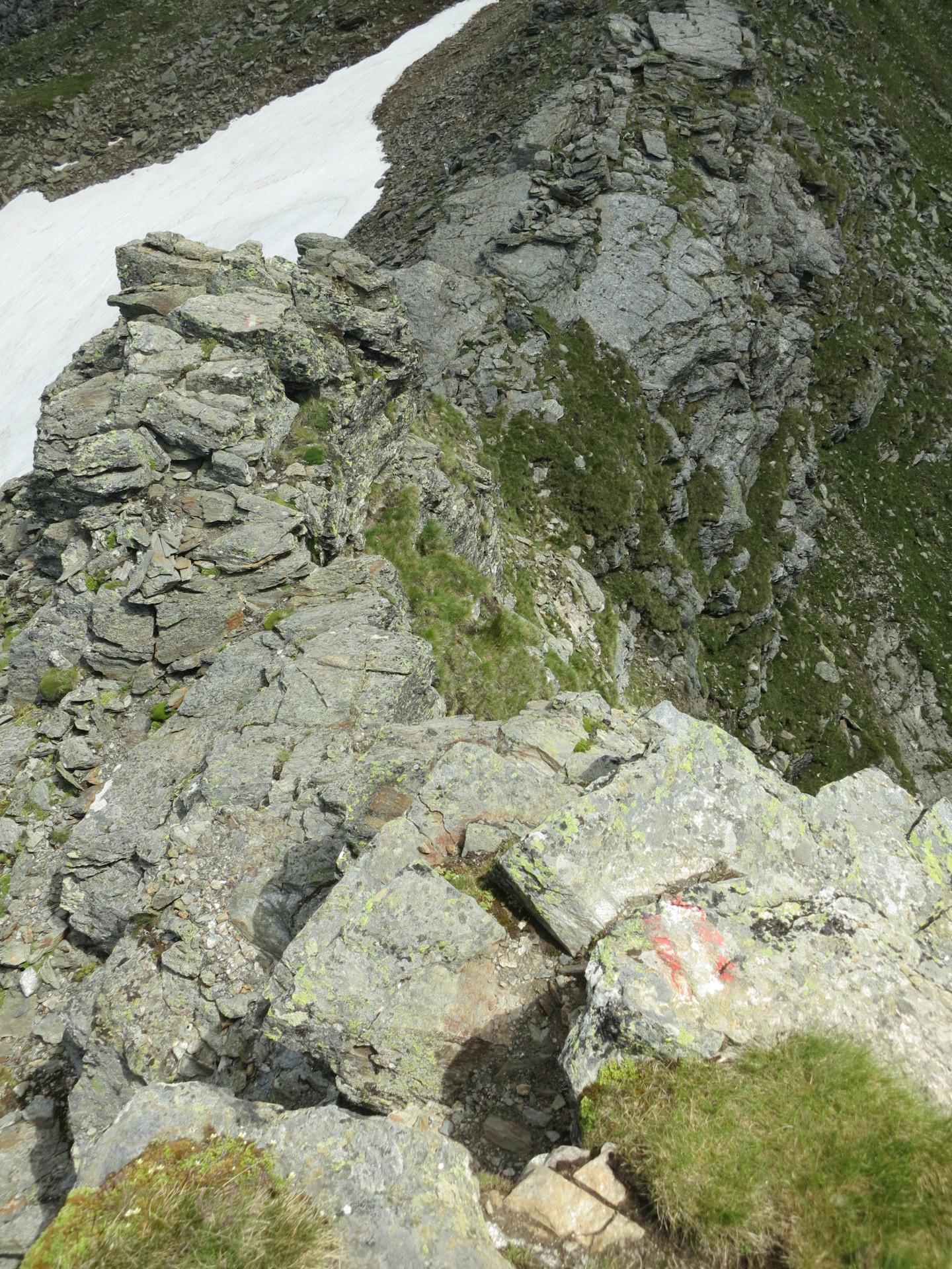 Schlüsselstelle dieser Tour ist der Übergang an der Niederen Scharte. Die kurze ausgesetzte Kletterei erfordert etwas Überwindung, und wer sich hier unsicher ist, sollte lieber umkehren. So wie auch meine Freundin und die beiden Hunde.
