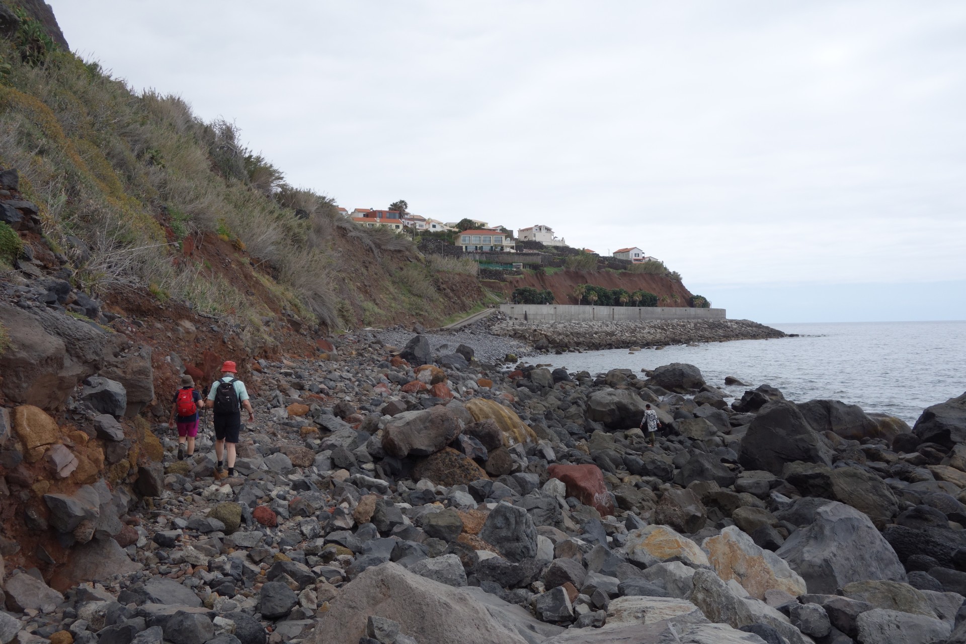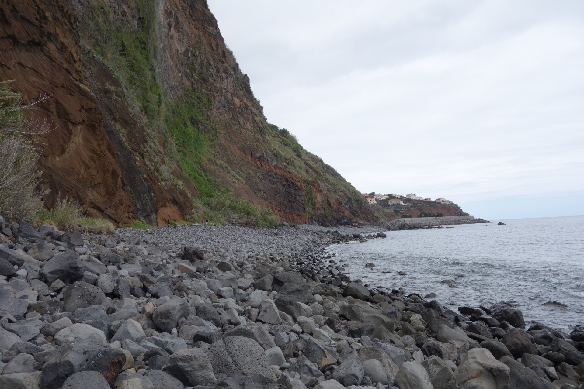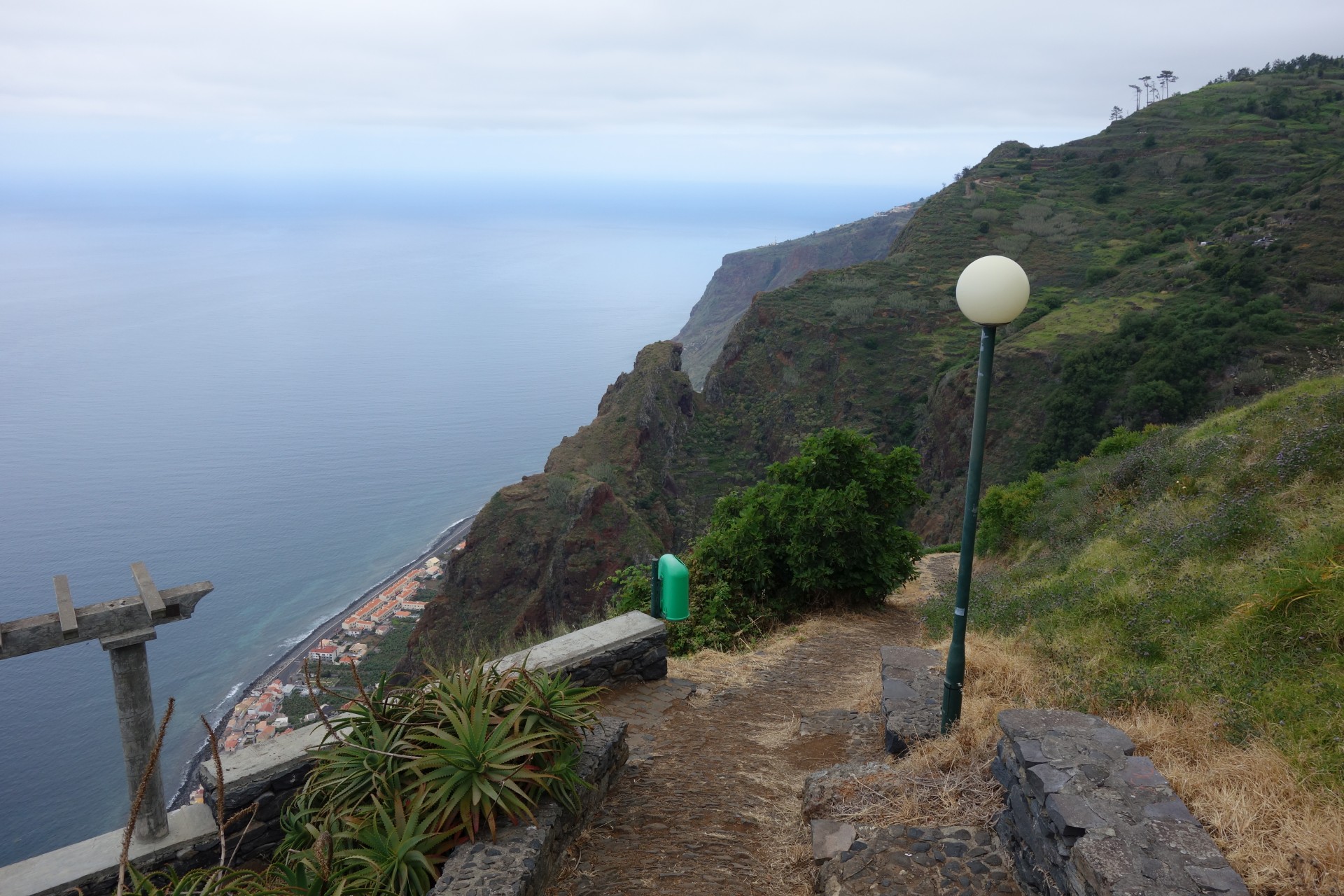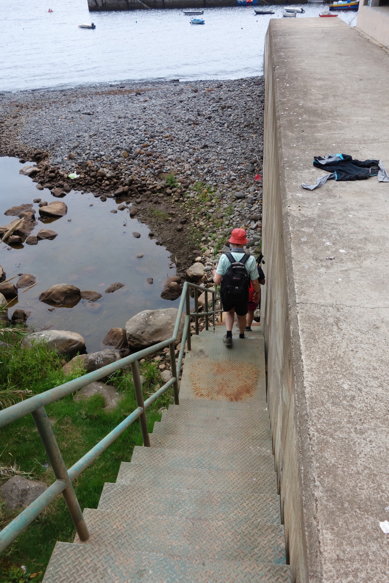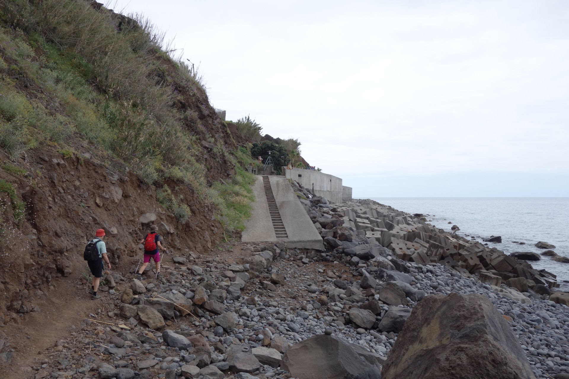Vom Hotel über Treppen hinunter zum Aussichtspunkt und ab da über unendlich viele runde Stufen in zahlreichen Kehren hinunter zum Hafen von Paul do Mar. Dort über die Mauer zum Strand und diesem weglos bis nach Jardim do Mar.