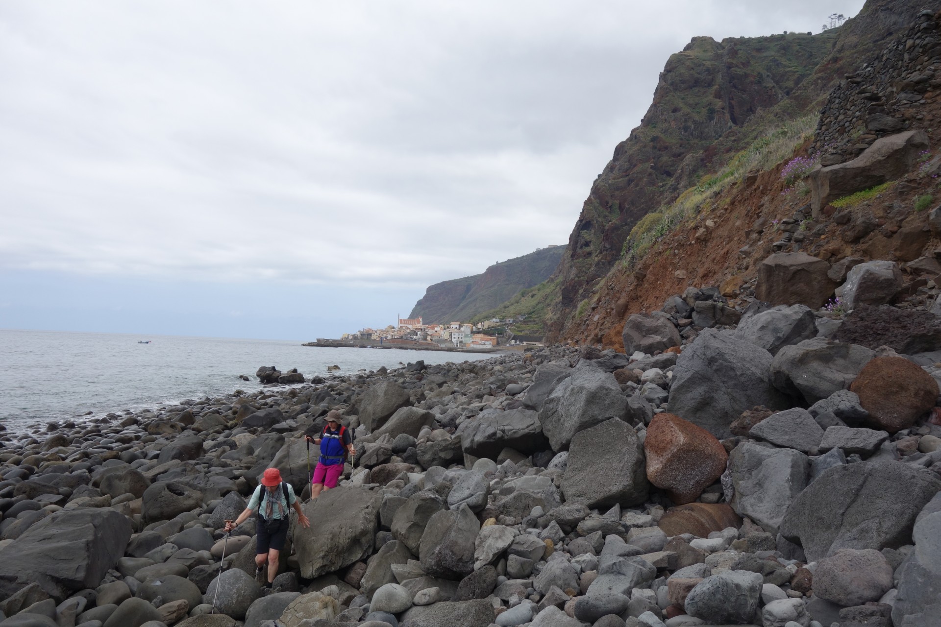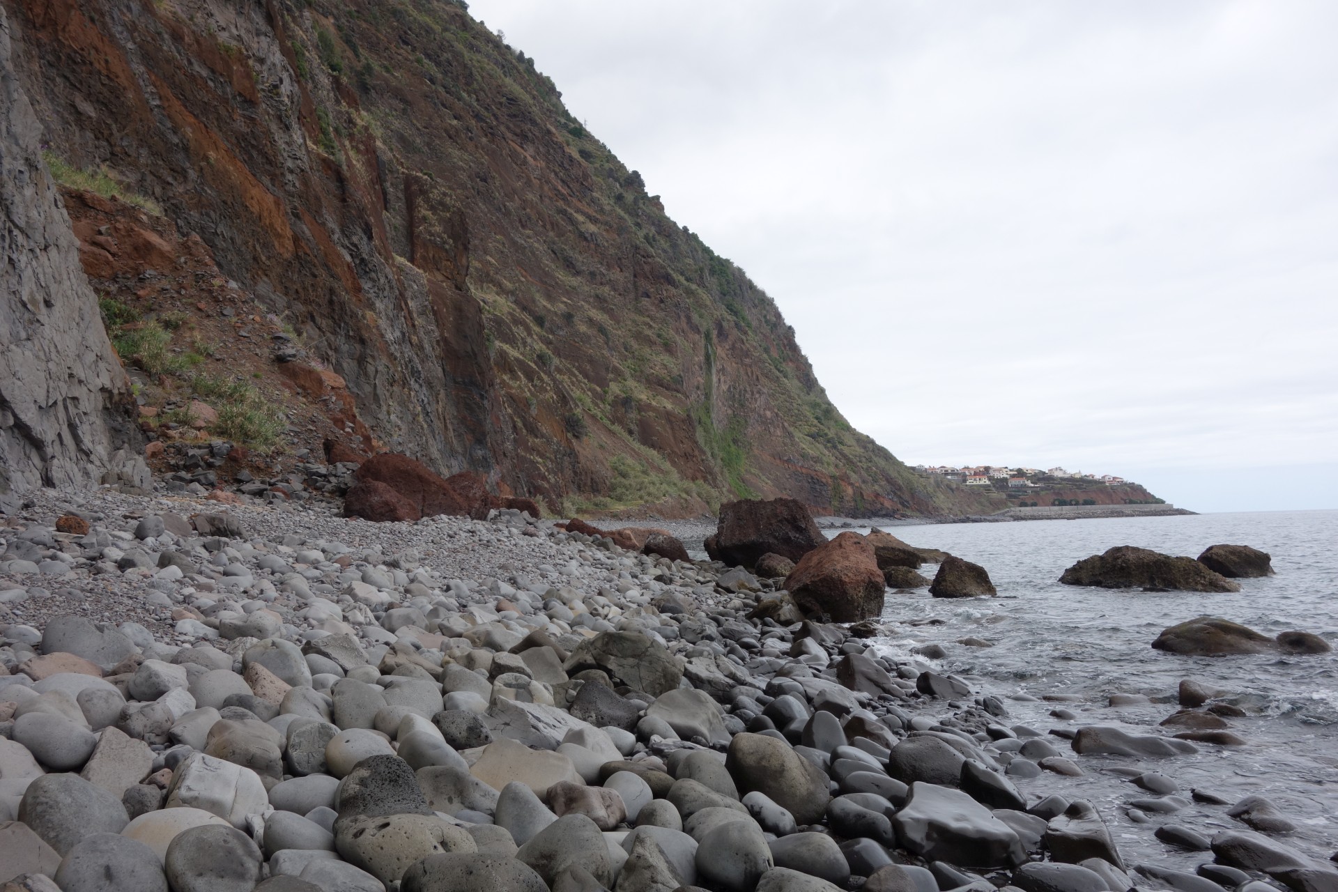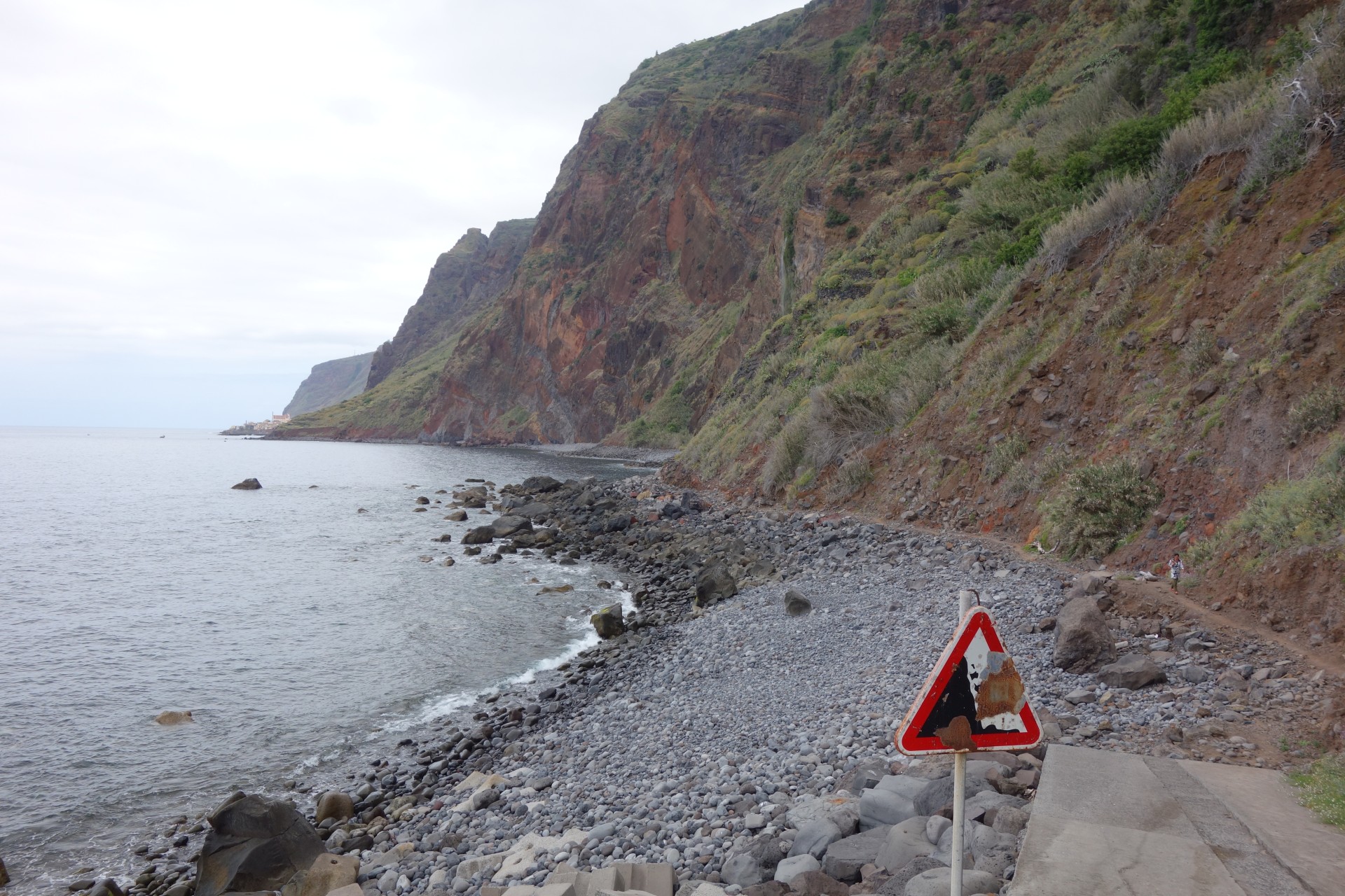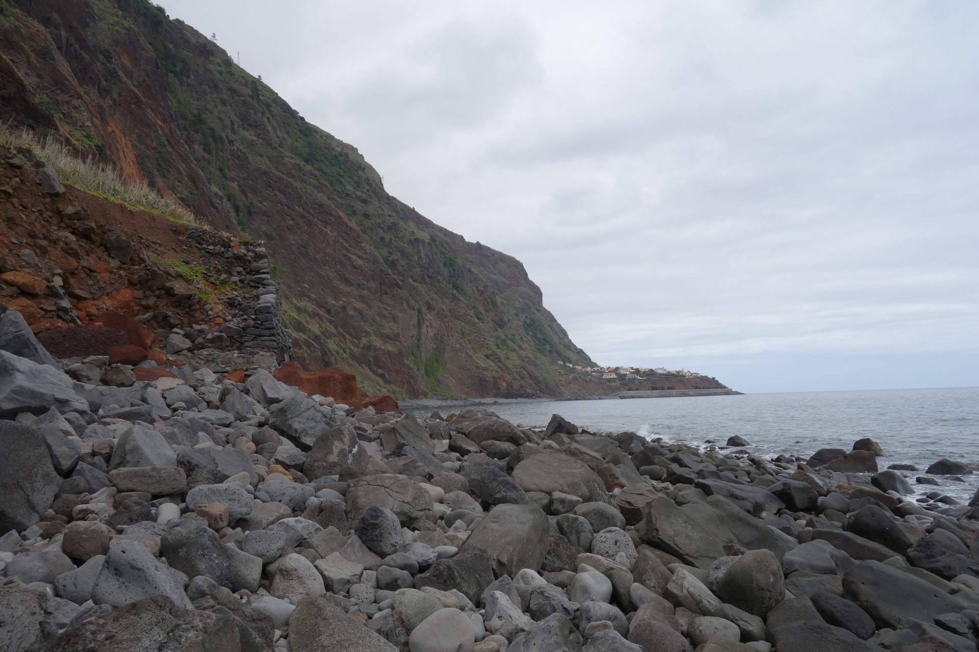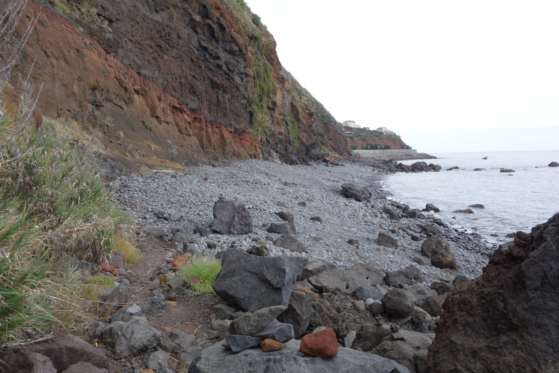 Vom Hotel über Treppen hinunter zum Aussichtspunkt und ab da über unendlich viele runde Stufen in zahlreichen Kehren hinunter zum Hafen von Paul do Mar. Dort über die Mauer zum Strand und diesem weglos bis nach Jardim do Mar.