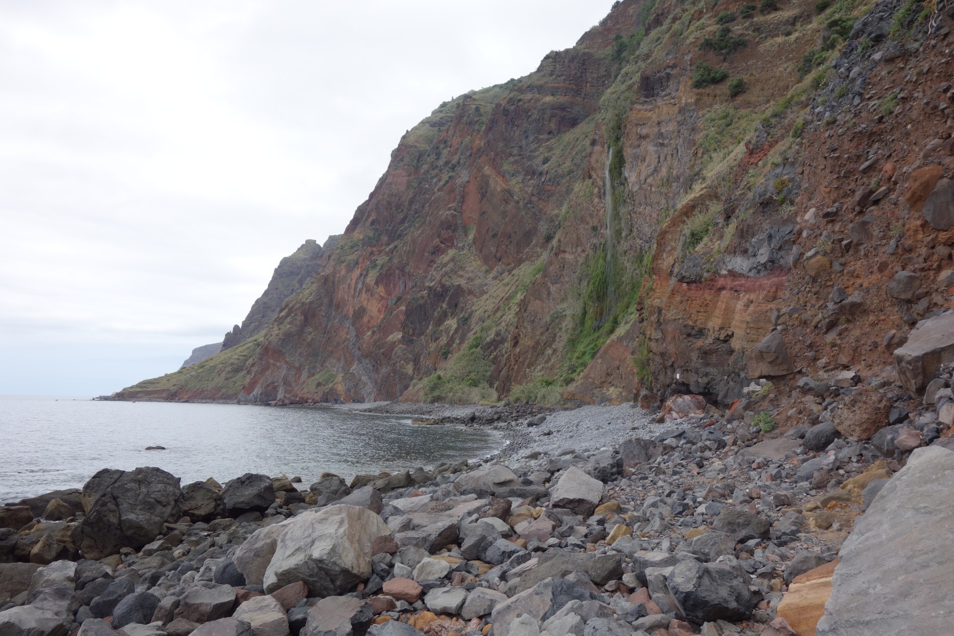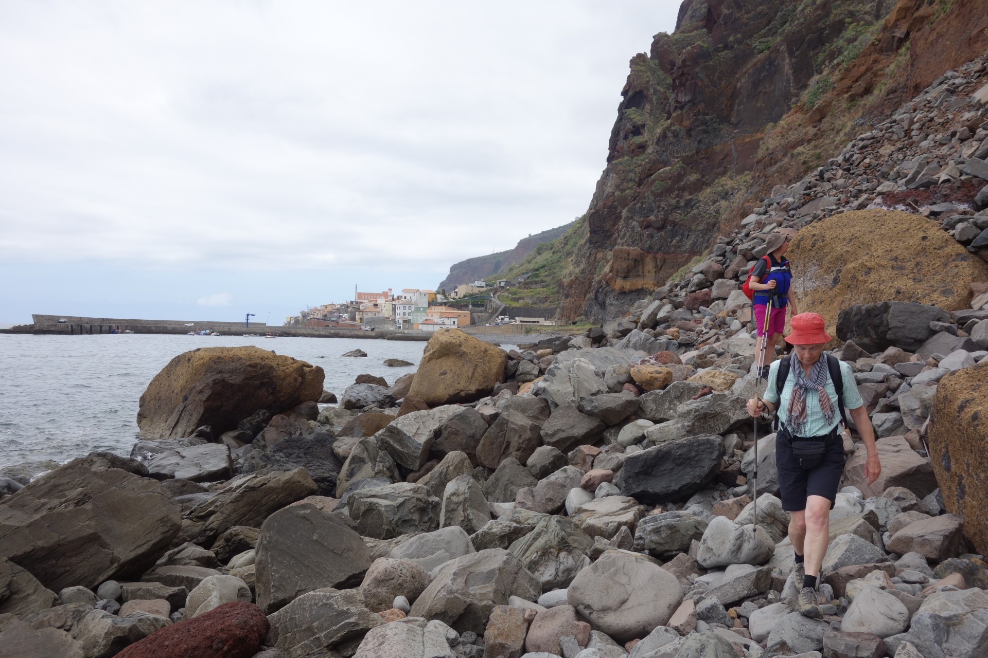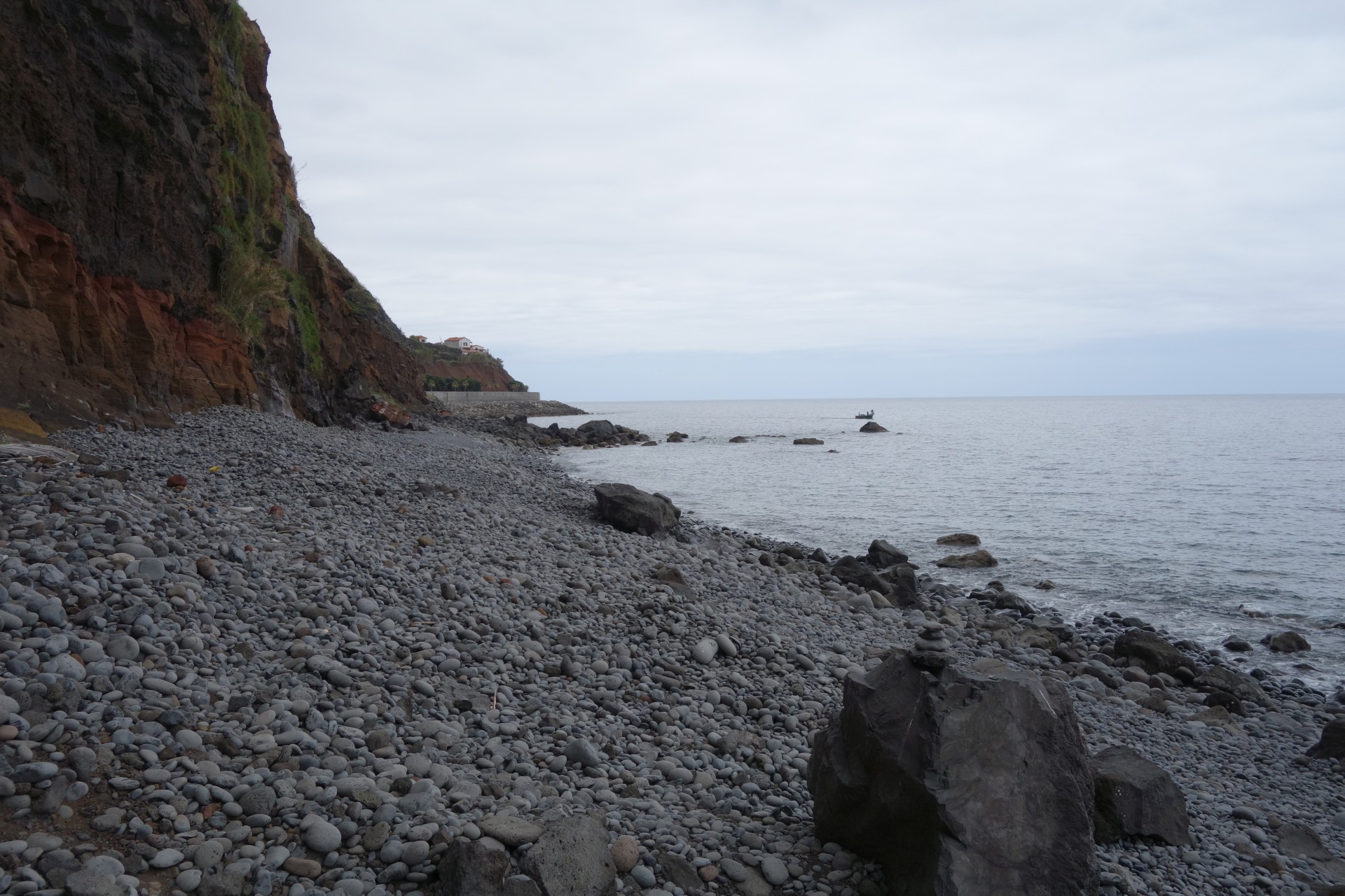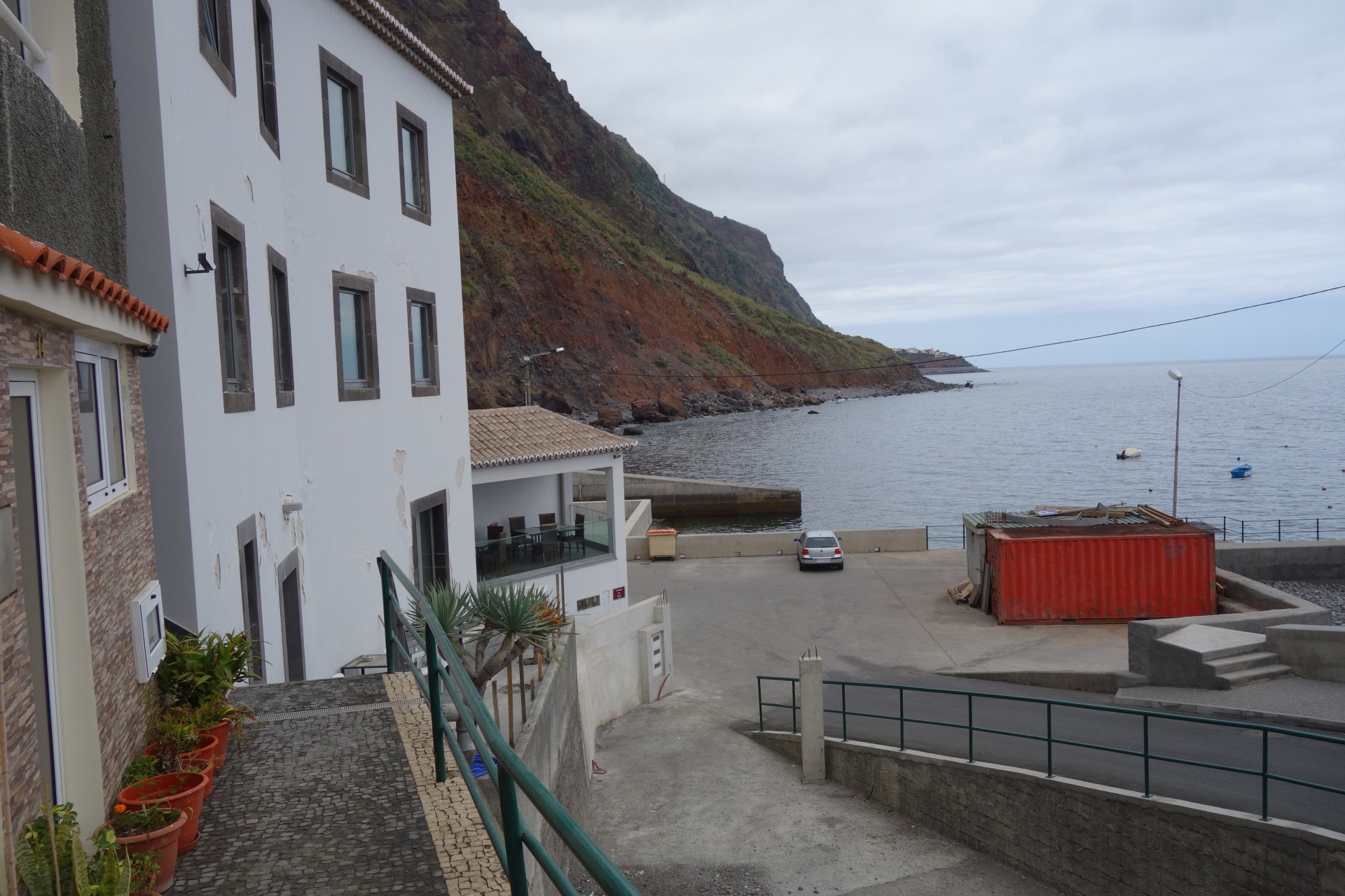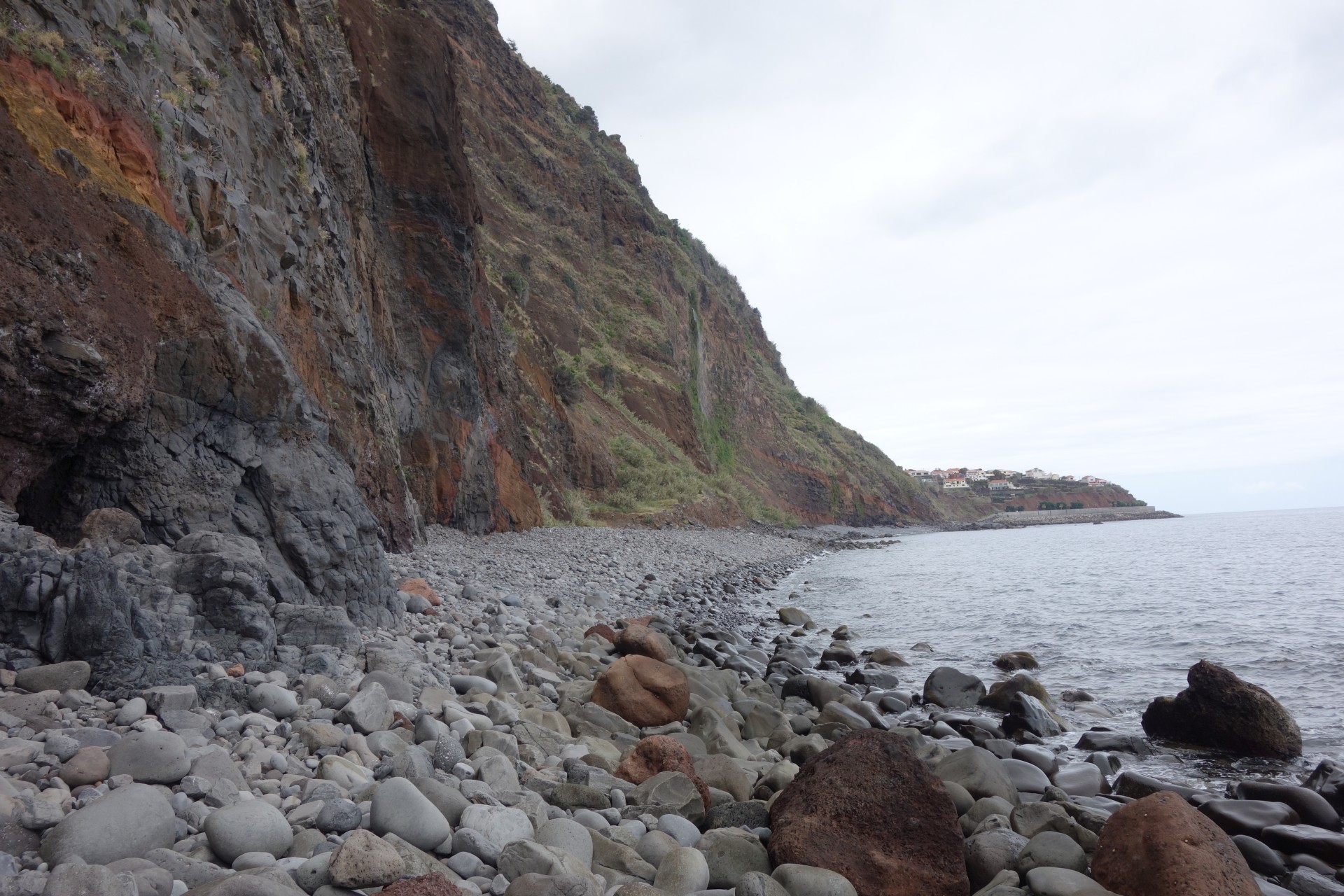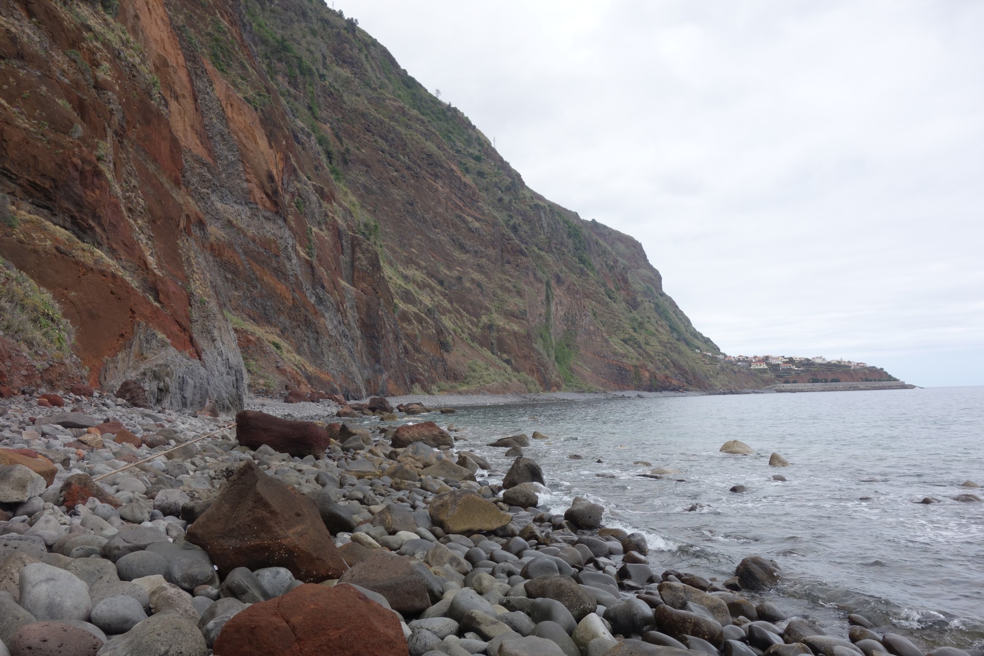 Vom Hotel über Treppen hinunter zum Aussichtspunkt und ab da über unendlich viele runde Stufen in zahlreichen Kehren hinunter zum Hafen von Paul do Mar. Dort über die Mauer zum Strand und diesem weglos bis nach Jardim do Mar.